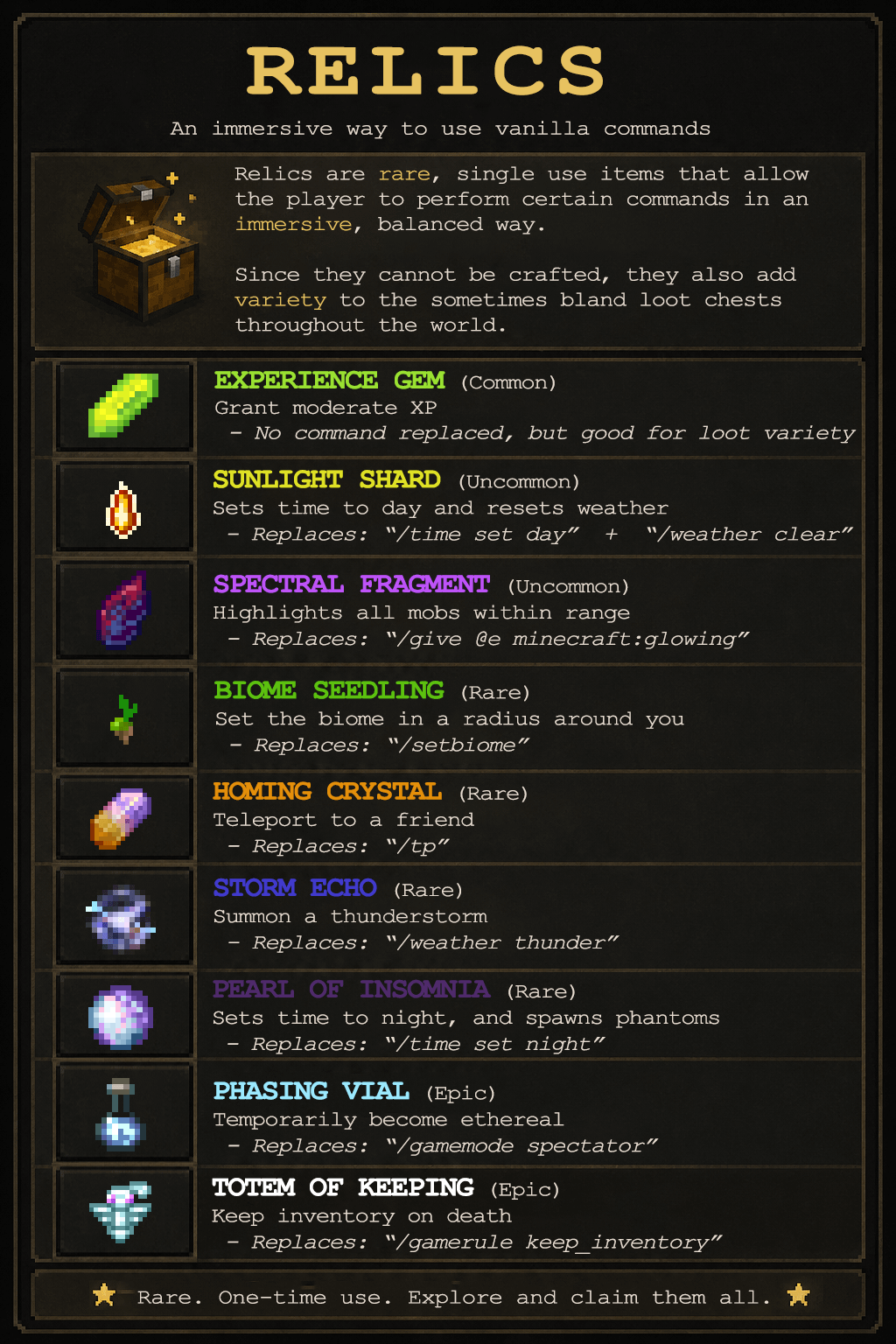 The purpose of these relics is two-fold: allow players to perform certain commands in an immersive and balanced way, and add variety to loot chests. First, as any long-term world owner (especially a server owner) will tell you, sometimes using commands is necessary! Playtime is limited, especially in a family setting, and it becomes a choice between “cheating” and just not having a good time. Maybe you’re exploring the End as a group for hours only for someone to die: sure, you could pause everything for 30 minutes while they rejoin the group.. or you could “/tp” and carry on having fun. Or maybe you’ve been searching for the stronghold for a good 20 minutes now, and people are getting bored: sure, you could keep on manually searching… or you could change your gamemode to spectator for 10 seconds and carry on having fun.
