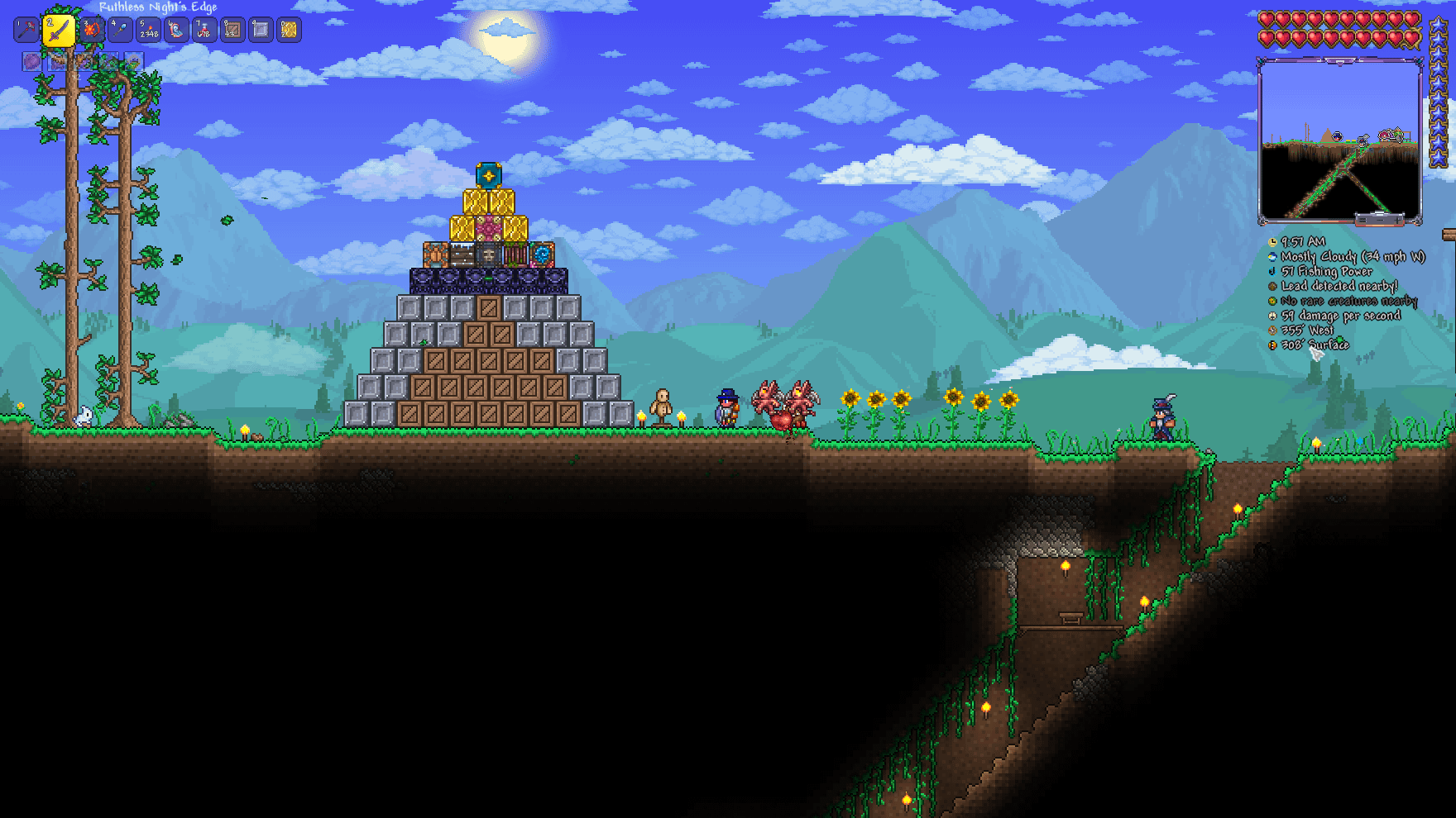 Went on a quest to get the angler fishing items, saw a short about max fishing power setups, sidetracked to fishing out biome crates. I am pretty sure shimmering these ones will NOT give me hardmode ores as per the wiki but hey, I have a crate pile and stock for days. Also, that's Bart, my totally willing crate watching volunteer. Say hello to Bart.