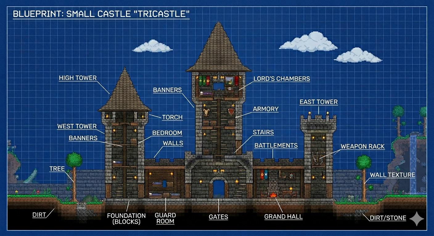 I was looking for inspiration on gemini for building my first castle, and he suggested this design. I'm also thinking of surrounding it with a moat! I'm thinking of adding rooms for NPCs underground. What do you think? 🙂 by ilsnk Terraria