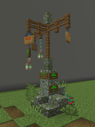 These use mossy cobblestone and spruce, with copper lanterns.