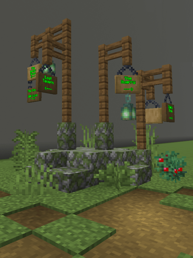 As the number of builds on the server grows, I’ve been running into a problem….there are just too many directions to show on a single crossroads sign. So I started experimenting with some “multi-sign” signposts.