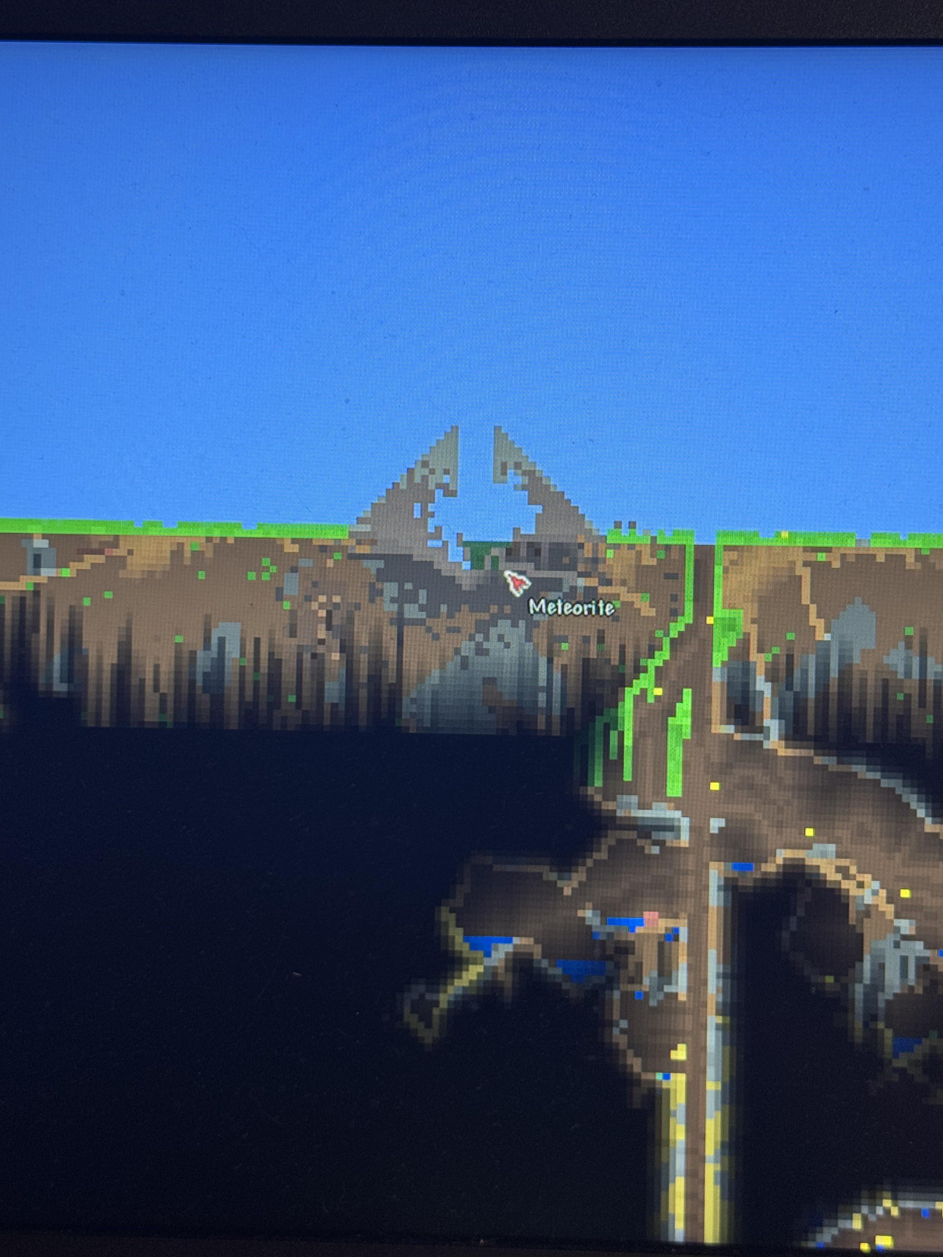 By the way, something that might be useful to know for anyone reading this: if you don’t like meteors, build a sky bridge. More specifically, high enough up for space music to play. Meteors are not allowed to hit anything this high, so a skybridge across the world will prevent meteors from landing at all. If you want, you can leave two block gaps where you’re okay with meteors falling, but you don’t need to.