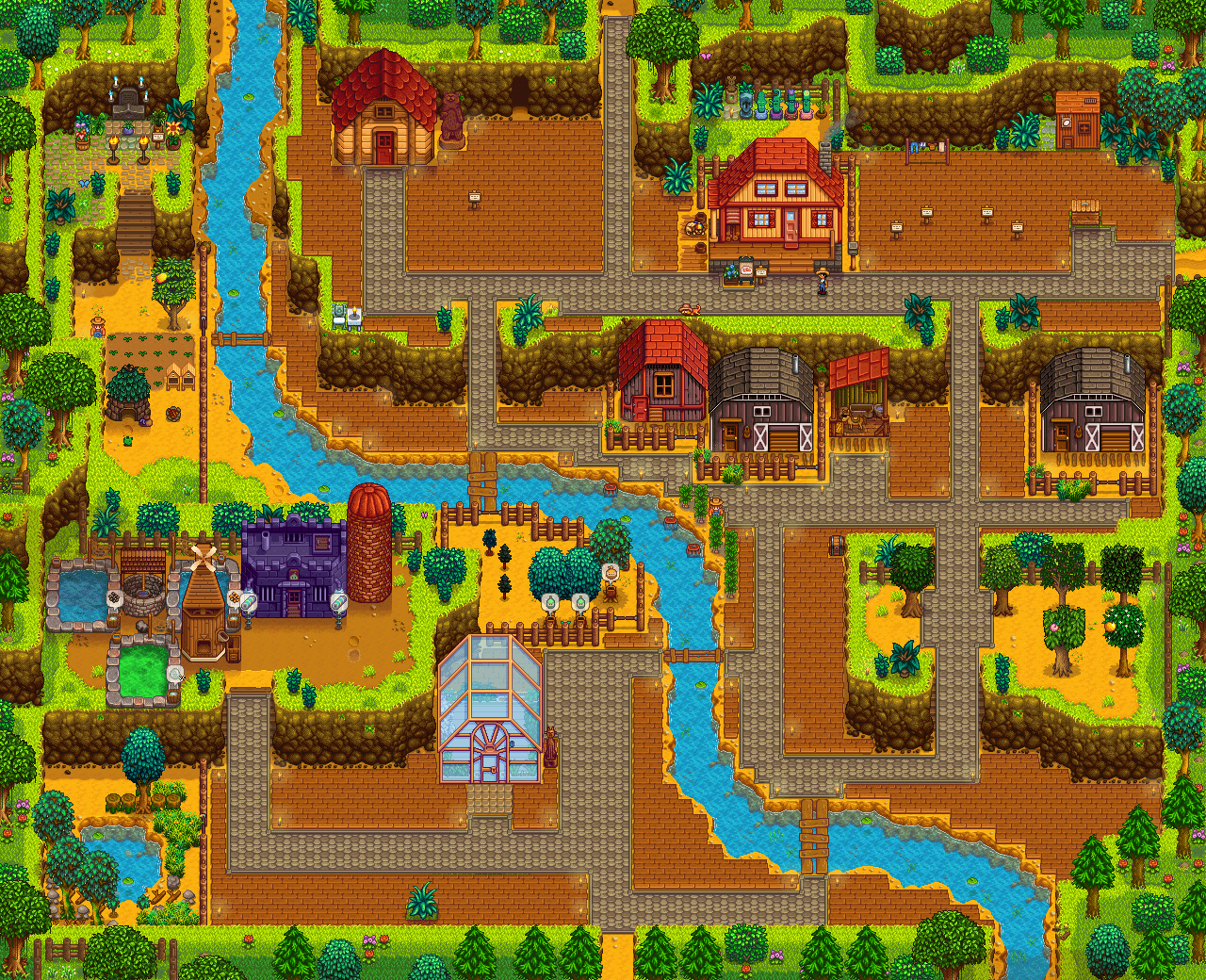 finally got to y8 and decided to lock in and decorate my farm! the signs are placeholders for the golden clock and obelisks! by argistofpav Stardew Valley