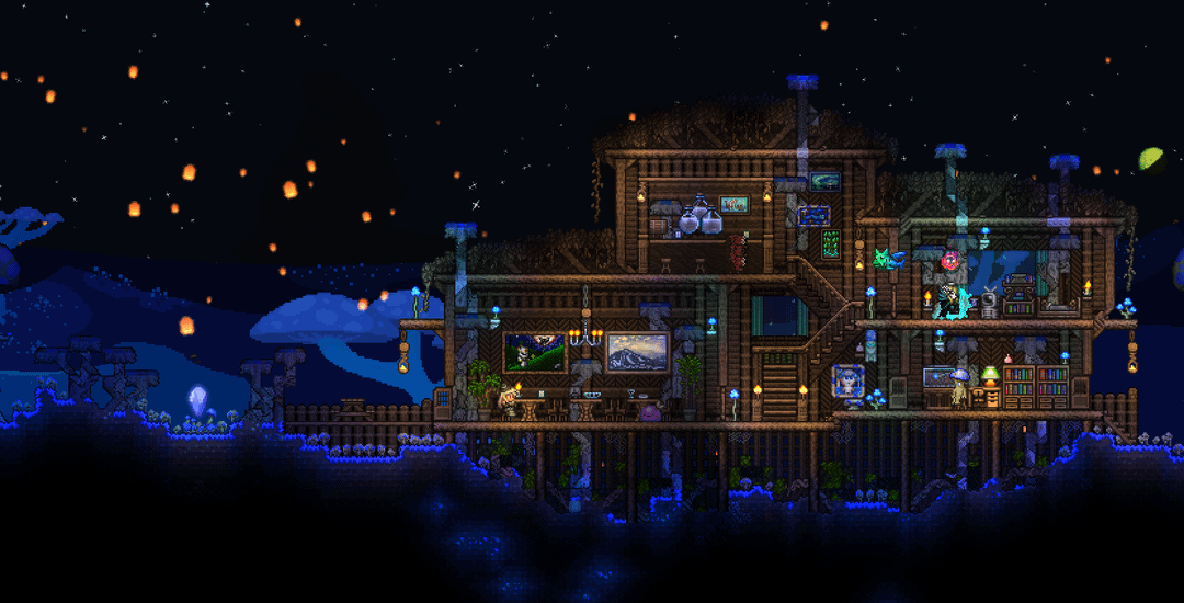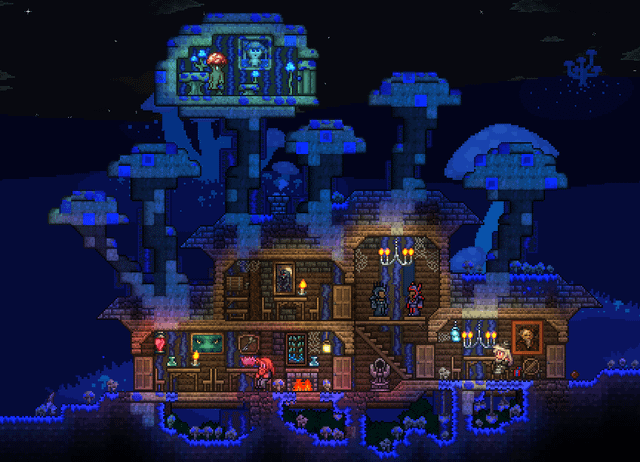 The first house I built in this world was made out of wood and stone bricks. When I reached hardmode I needed an above ground glowing mushroom, my thought was to make my first house overgrown with mushrooms. That house was there up until a month ago when I wanted something else for spawn. That left my world without a glowing mushroom, so I made a new one.