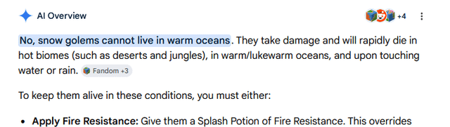Snow golems can live in warm oceans. I am making this post to help combat the misinformation from googles dumb A.I. by HinaTheFox Minecraft